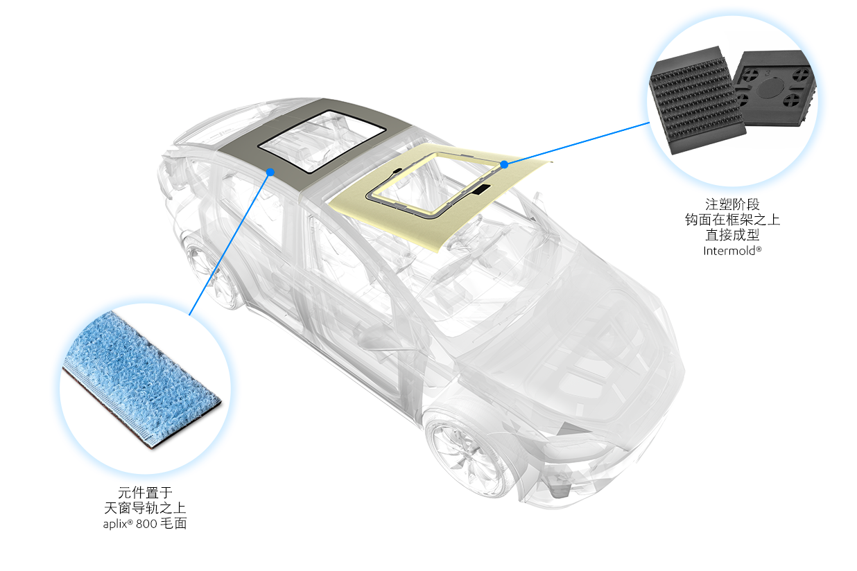 得益于Intermold®技术,APLIX推出一体化解决方案,将汽车顶蓬内衬固定于天窗框架,无需挡板,从而显著改善设计。